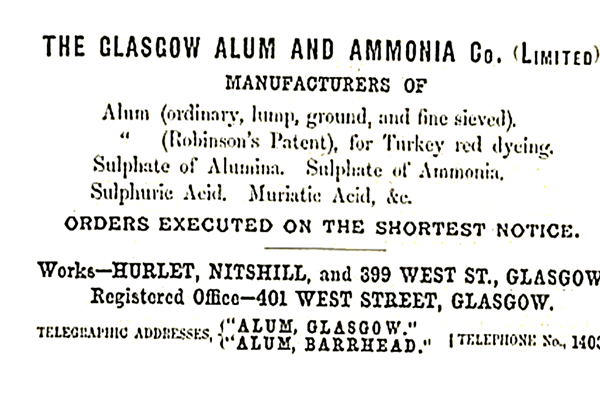 The manufacture of sulphate of iron or copperas was introduced into Scotland by Messrs Nicolson and Lightbody of Liverpool, who established their works at Hurlet in the year 1753. A similar establishment for manufacturing copperas was beg un at Nitshill in 1807, and carried on by Messrs Wilson and Sons, who, in 1820, had bought the old copperas works at Hurlet, which was then converted into an extensive alum works by Mr Wilson Junior, the managing partner of that company. The manufacture of alum was also first introduced into Scotland by Nicolson and Lightbody at their works at Hurlet in 1766 and 1767. Alum was used as a mordant in the cloth dyeing process to ensure that colours did not run out when the textiles were washed. Other uses of alum included flameproofing textiles, in baking powder, and in medicines to reduce mucus, and to stop bleeding. However, Nicolson and Lightbody’s manufacturing was process defective and was abandoned within two years. In 1797, another works was launched at Hurlet by Mr Macintosh and Mr Wilson and the manufacture of alum was successfully established and went on to produce a large and steady annual supply of alum, manufactured on correct chemical principles. Large quantities of muriate of potash and sulphate of ammonia were also manufactured due to the connection with the alum process. The muriate was extracted from kelp, and from the ammonia liquor produced at a gas works in Glasgow, and the resulting chemical was important to the numerous bleachfields and printworks of Glasgow and Paisley, Barrhead and Pollokshaws.