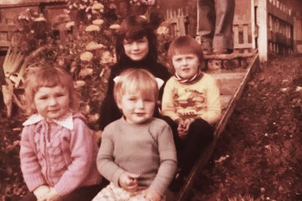 1976, in their Gran’s back garden in Pollok - Tracy, Jim, Cheryl & Steven